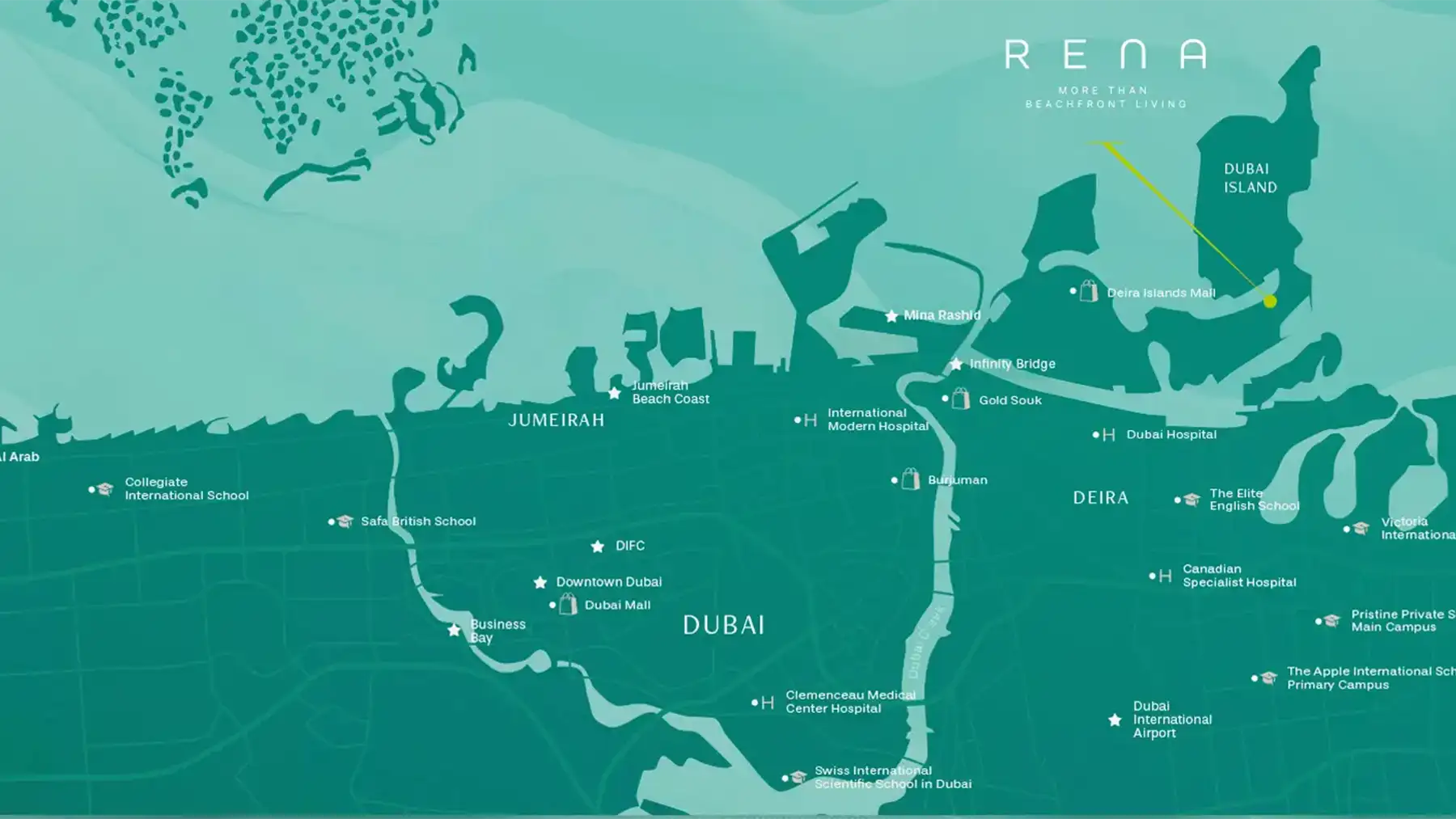 Rena is well situated on the Dubai Islands, providing breathtaking views of the waterfront, easy access to the beach, and first-rate access to Downtown Dubai, Dubai International Airport, and Dubai Marina, among other important parts of Dubai.
