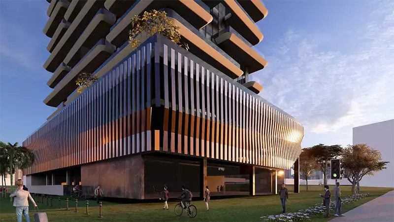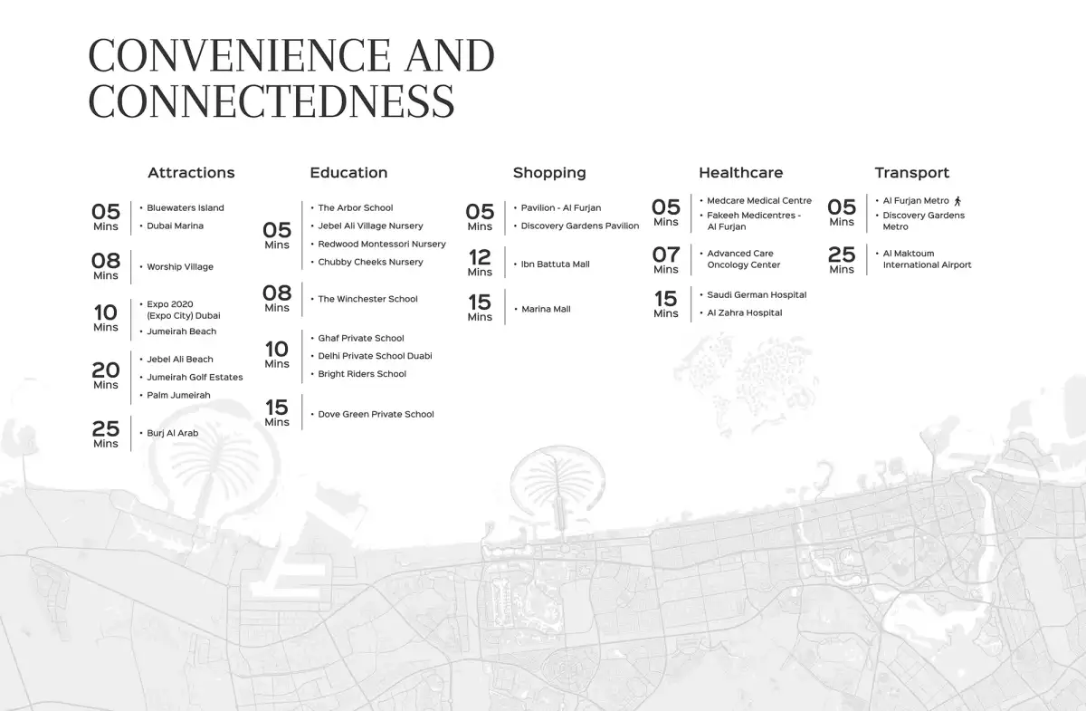 This 15-storey architectural landmark features a sleek glass façade, clean lines, and well-proportioned balconies, complemented by landscaped podium terraces and outdoor leisure spaces. The development enhances Al Furjan’s evolving skyline while delivering a balanced suburban lifestyle surrounded by essential and leisure amenities.
