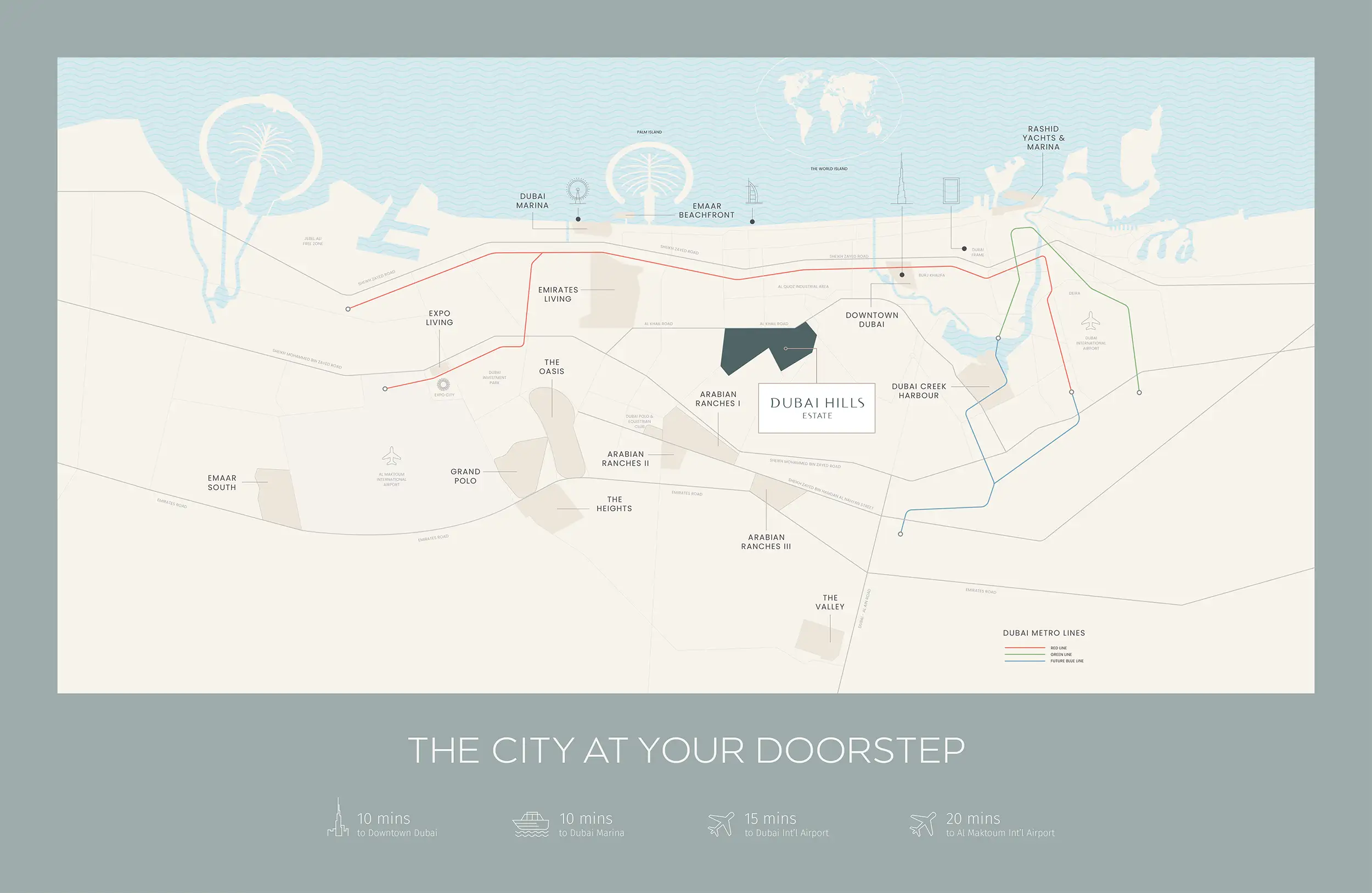 Though located in the vibrant core of Dubai Hills Estate, Rosehill offers a tucked-away tranquillity a green enclave that balances nature's stillness with urban convenience. Residents enjoy seamless access to Dubai Marina, Downtown Dubai, and both Dubai International and Al Maktoum Airports. The project is ideally positioned between Dubai Hills Mall, King’s College Hospital, and elite international schools—bringing shopping, healthcare, education, and recreation all within arm’s reach.