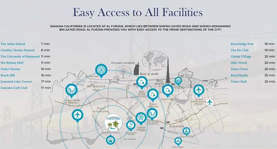 SAMANA California is situated near Sheikh Zayed Road and Emirates Road in Discovery Gardens. With convenient access to a wide range of amenities, SAMANA California makes daily living easier for you. This property just connects you to everything, including schools, healthcare facilities, and famous monuments.