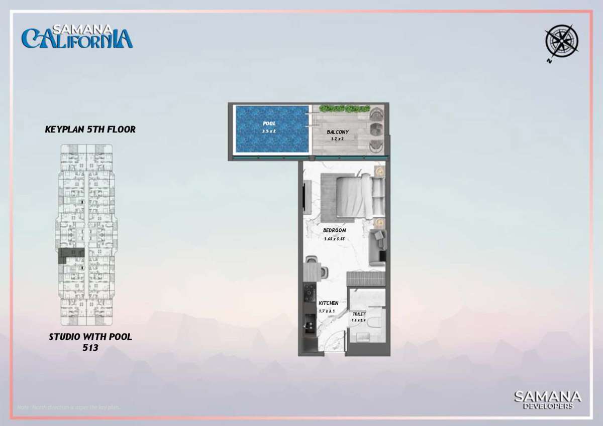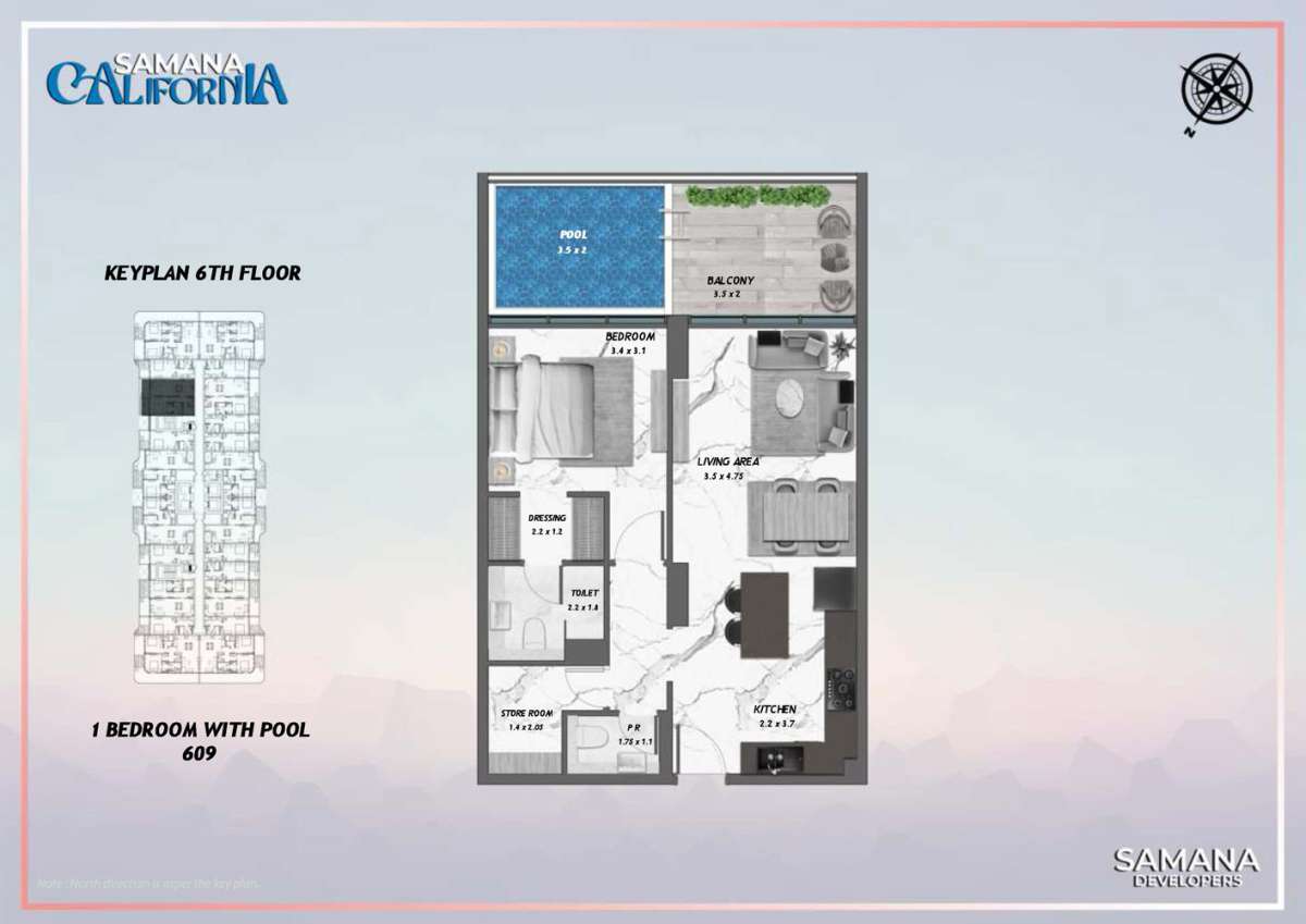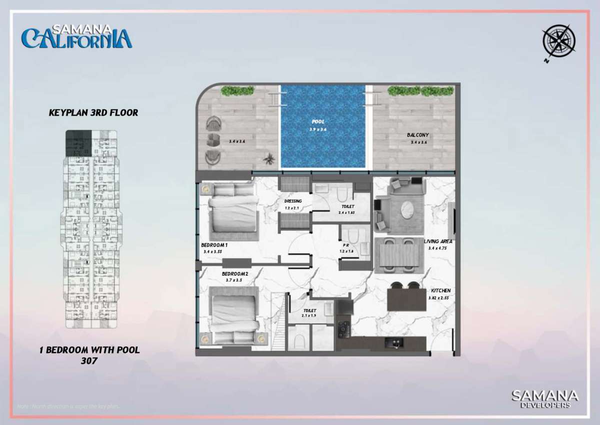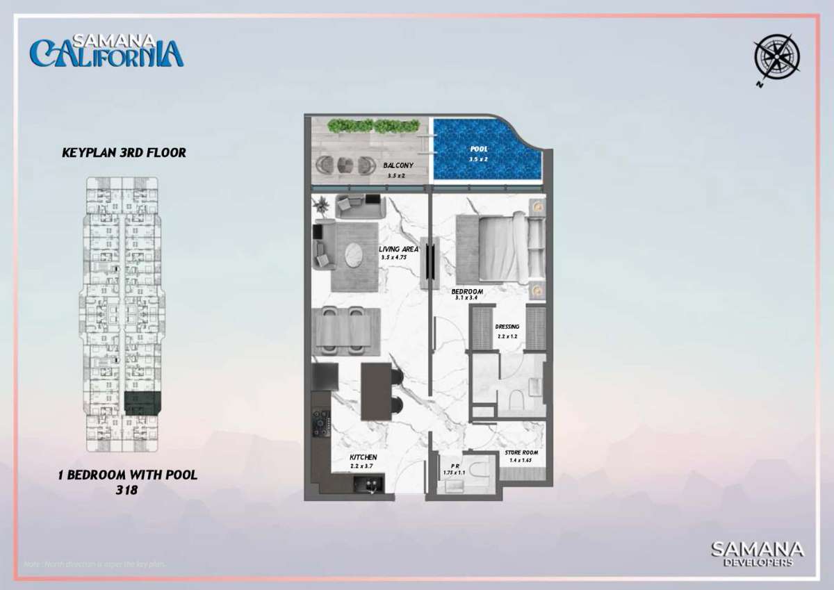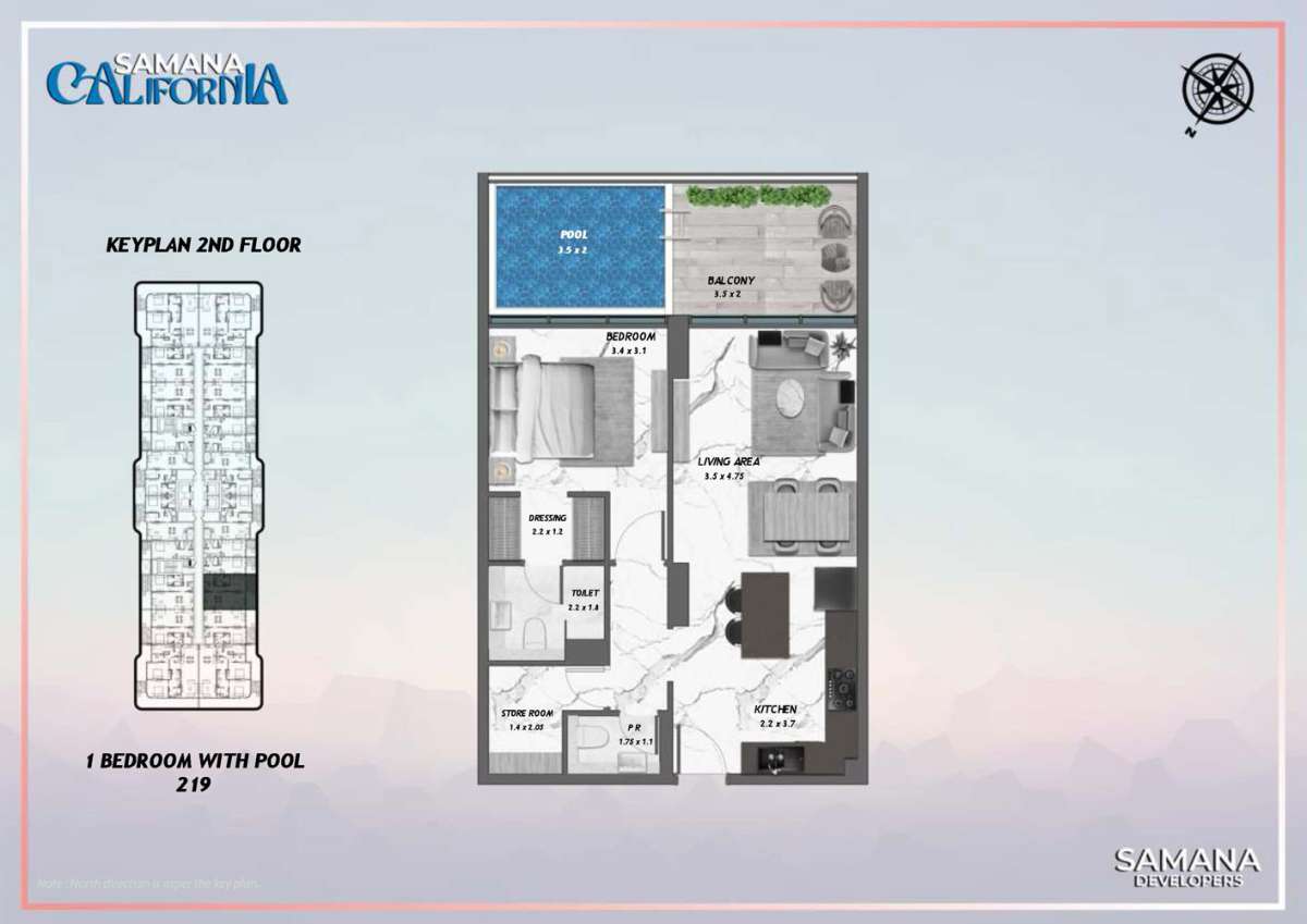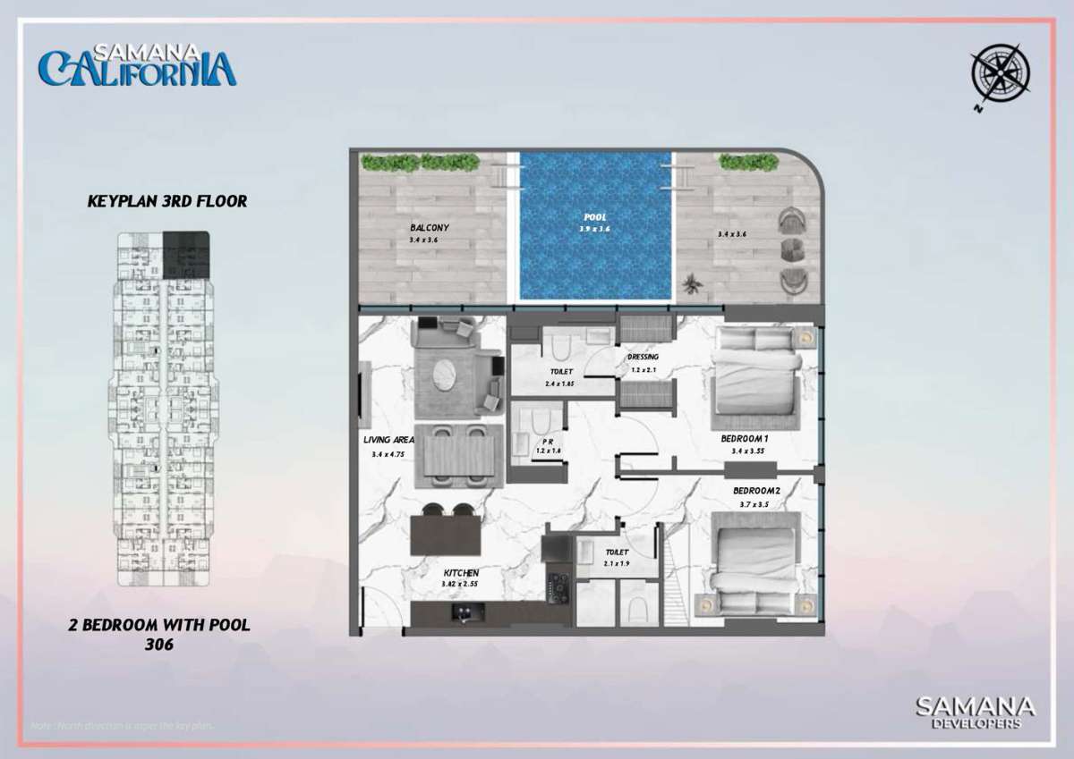 Comfort, style, and contemporary living are all combined in the residential haven of Samana, California. These luxurious studio, one-bedroom, and two-bedroom apartments are all built to maximize comfort and practicality. The open layout creates a rejuvenating living space with lots of natural light and ventilation. However, the addition of swimming pools sets these apartments apart and provides residents with a true haven.