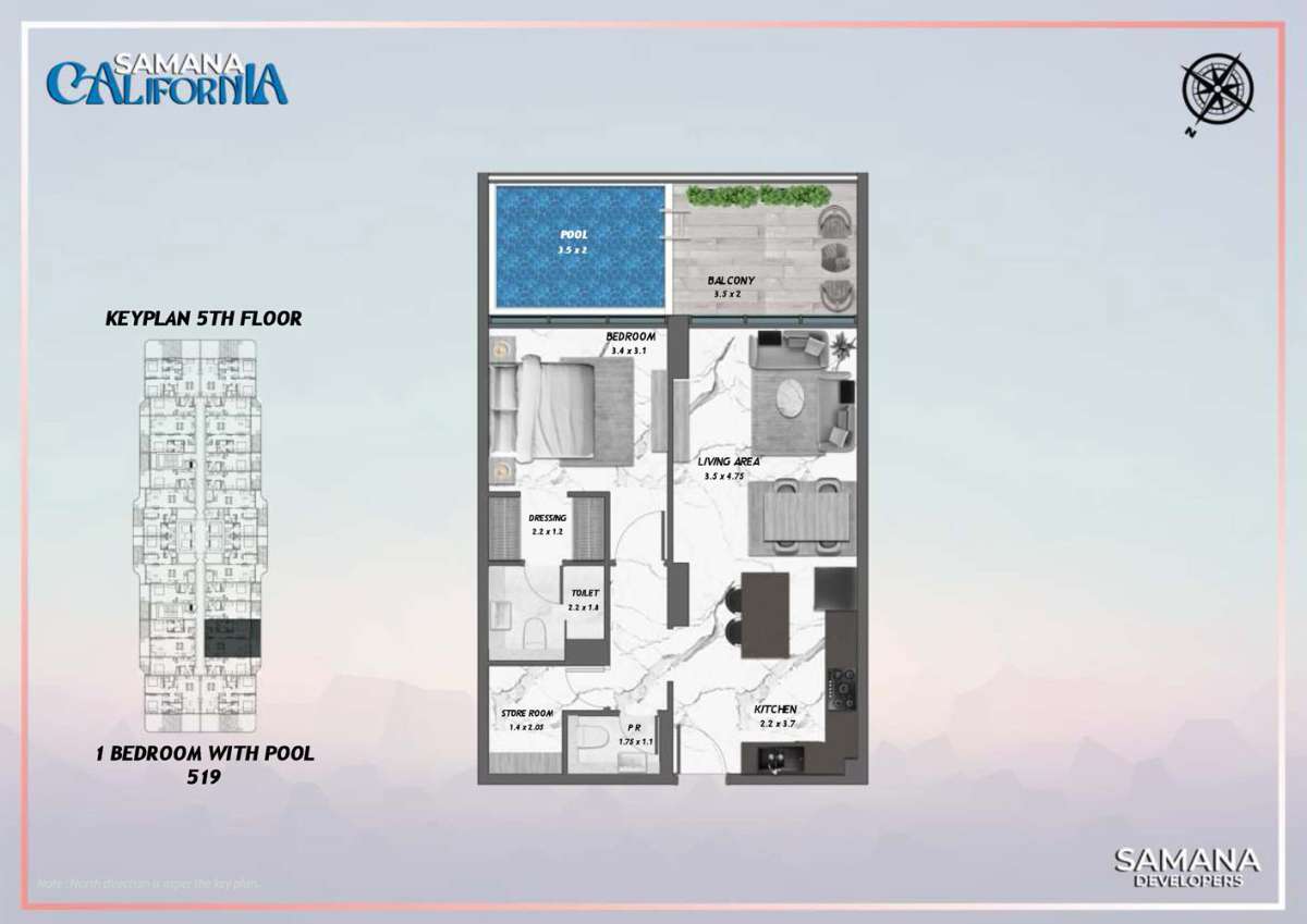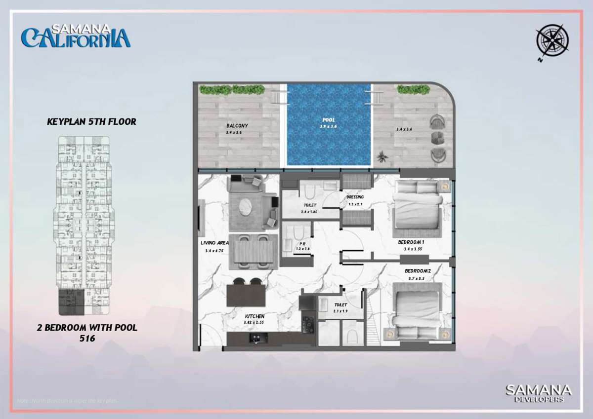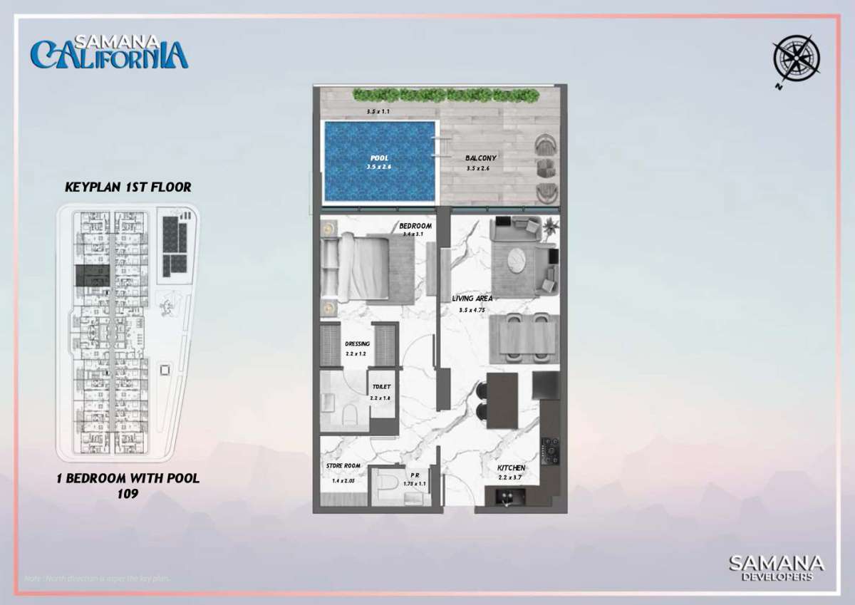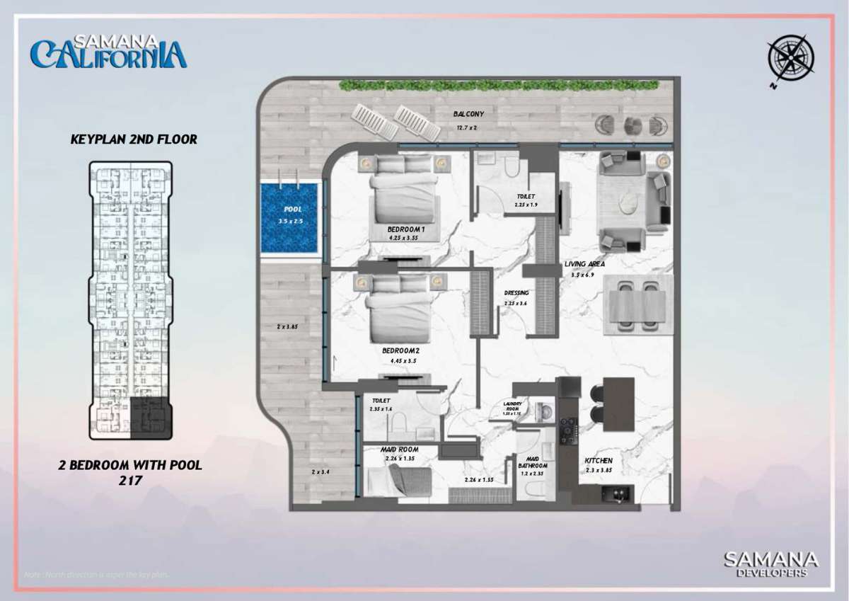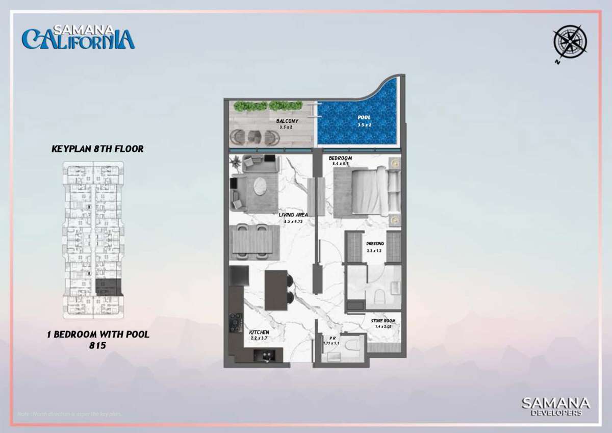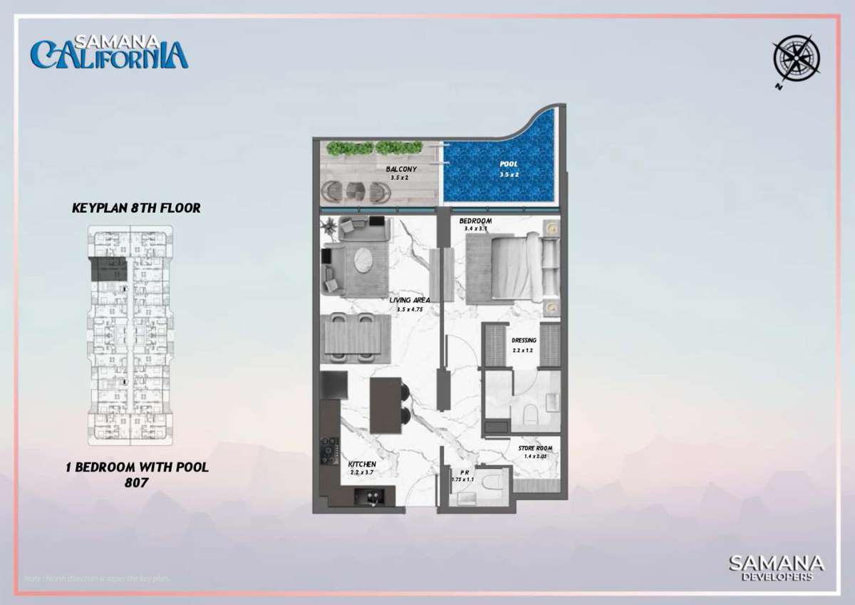 Comfort, style, and contemporary living are all combined in the residential haven of Samana, California. These luxurious studio, one-bedroom, and two-bedroom apartments are all built to maximize comfort and practicality. The open layout creates a rejuvenating living space with lots of natural light and ventilation. However, the addition of swimming pools sets these apartments apart and provides residents with a true haven.