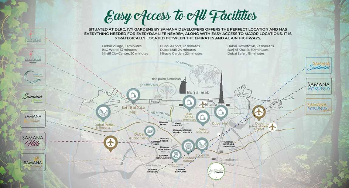 A brand-new, naturally inspired residential community comprising studios and one-, two-, and three-bedroom apartments with pools is called Samana IVY Gardens at Dubai Land Residence Complex (DLRC). Discover the luxurious and exceptional way of life in the city's most exclusive community within this 14-story building with a podium level. Residents can live a simple and refined existence in this amazing environment with the best lifestyle.