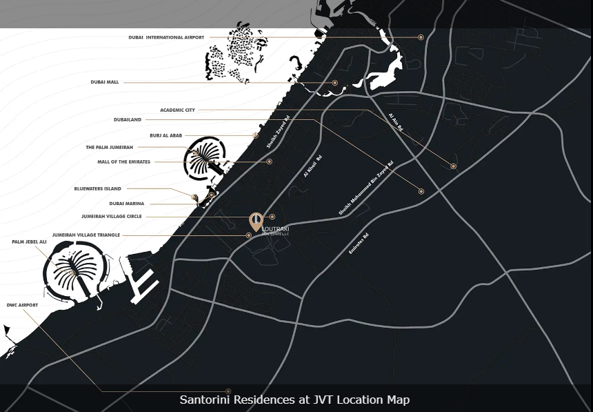 Santorini Residences by Loutraki is an upcoming residential development in Jumeirah Village Triangle (JVT), Dubai. It is strategically located in District 2 of JVT, offering easy access to Sheikh Mohammed Bin Zayed Road (E311) which connects with Al Khail Road (E44) in a short drive. The apartment building will offer an exquisite selection of studio, 1 and 2-bedroom apartments.