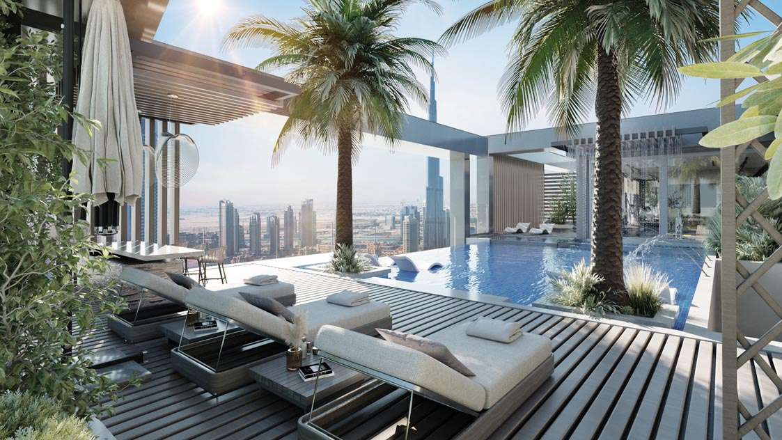 - Palm trees and lounging places on a beautifully landscaped rooftop deck