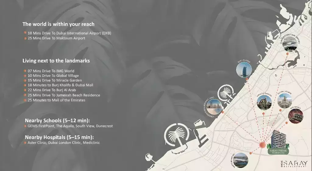 Saray Prime Residence offers convenient access to Dubai's main thoroughfares, commercial areas, and entertainment venues:
