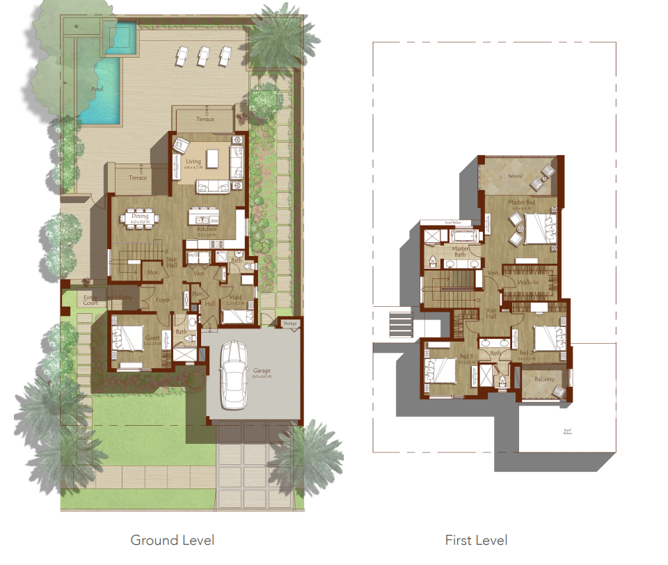 Properties in Sidra Villas II include 3, 4, and 5-bedroom spacious residences. These two-story villas come with tastefully designed master bedrooms with en-suite bathrooms and a built-in wardrobe, an expansive living area, a fitted kitchen, and a maid’s room. The private garden and pool are key features of these villas. Other features include a parking area, a balcony, and double-glazed windows in the living space through which residents can enjoy the scenic garden and pool views.