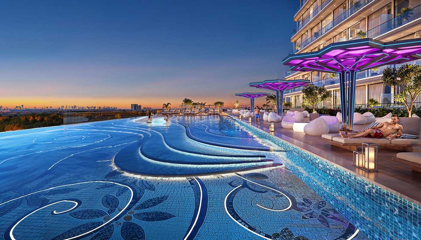 Its dynamic angular design and powerful energetic presence convey the architectural individuality. Through the use of geometric light effects, the façade's components mimic the flow of light on a diamond surface. The tower's radiant energy, which embodies Danube's approach to designing avant-garde, opulent spaces, makes it more than just a rising structure. An ambiance of great hotel opulence is created by the theatrical setting of the entrance area. Beautiful lift lobbies blend with a pool area that offers breathtaking views and opulent architectural features, demonstrating how the building's intelligent designs permeate every space. Even though the tower is a well-known landmark in Al Furjan, its vertical design makes it a dynamic masterpiece that never goes out of style.