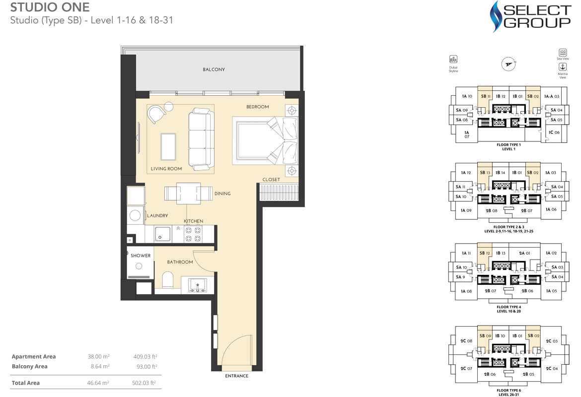 Studio, Type SB - Level 1-16 & 18 - 31 Size 502.03 sq ft