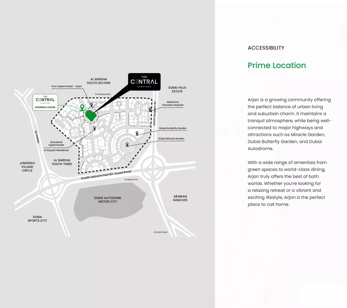 Because of its advantageous location at the intersection of Sheikh Mohammed Bin Zayed Road and Umm Suqeim Street, homeowners can easily access major highways and important locations, including Jumeirah Village Circle, Dubai Motor City, and Dubai Sports City. Thanks to neighboring stores like Spinneys and Ace Hardware, as well as respectable medical facilities like Park View Mediclinic, upscale shopping and necessary services are easily accessible.
