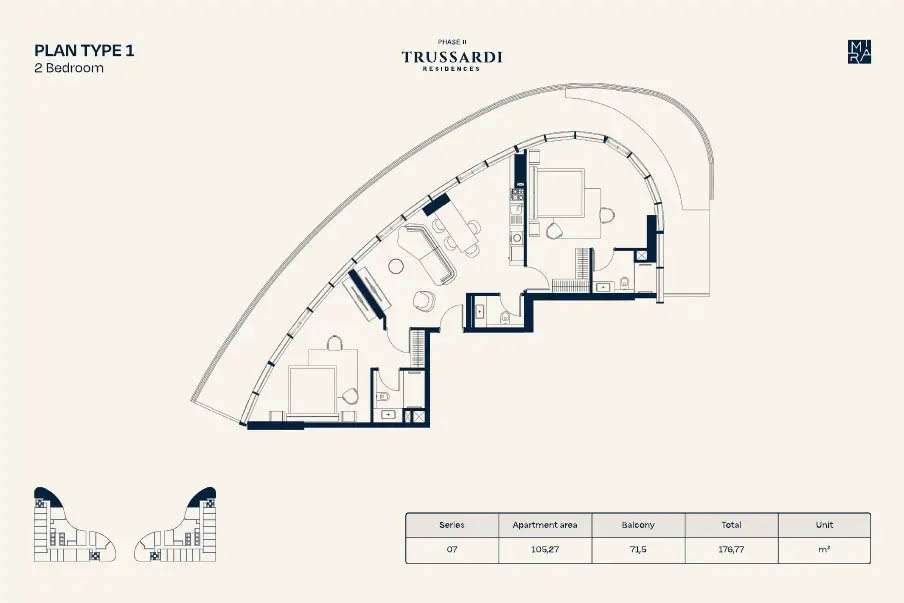 The large, well-designed apartments at Trussardi Residences 2 emphasize openness, natural light, and contemporary utility. Every house has: