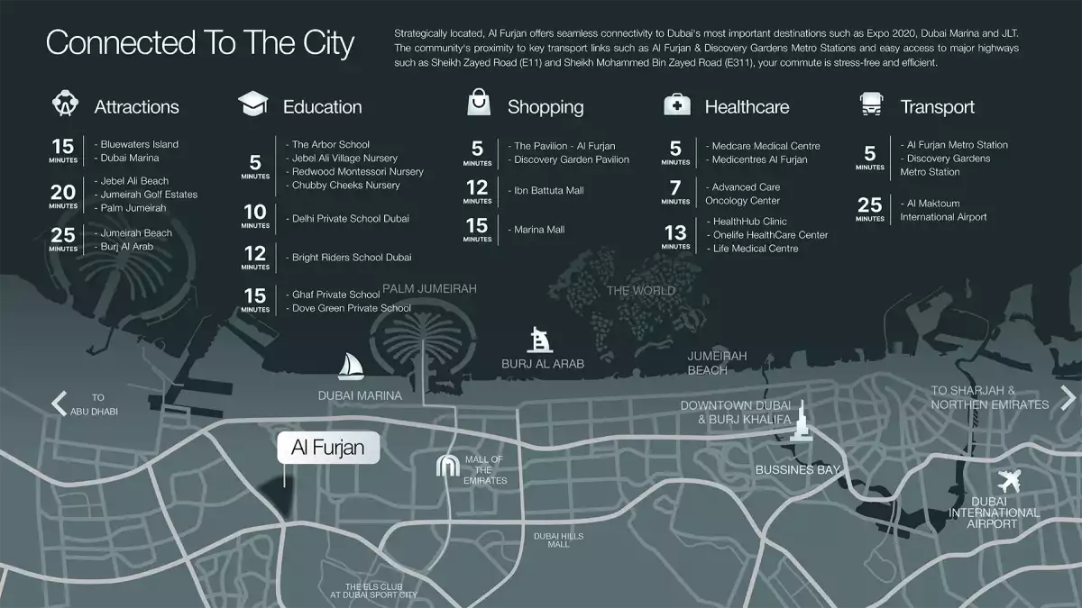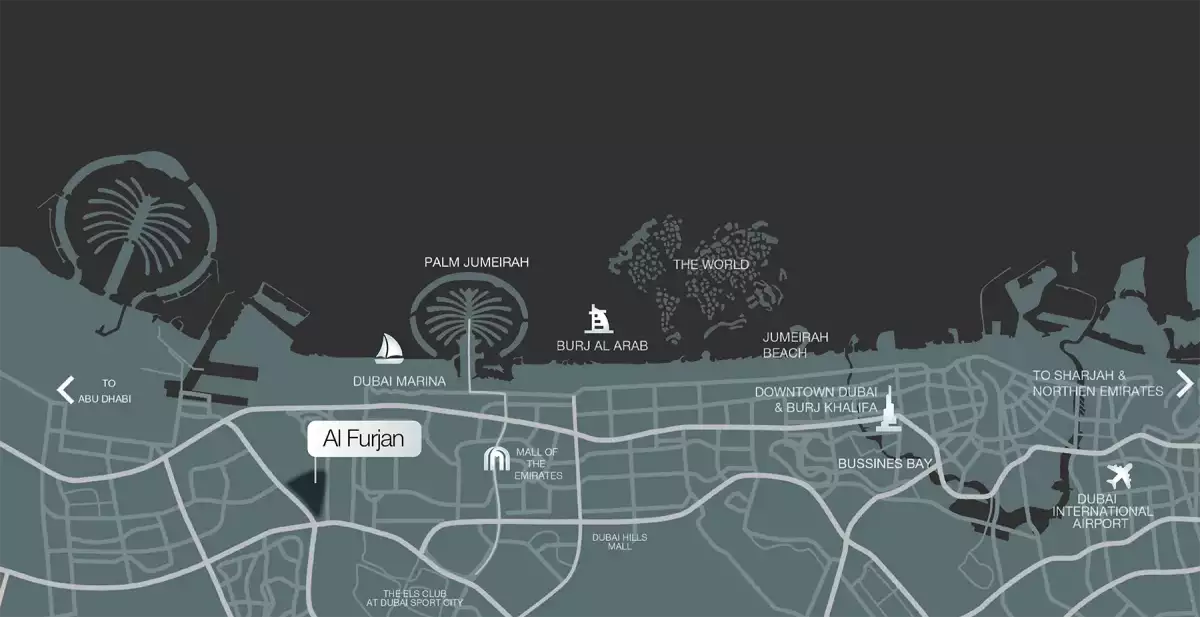 7. Road Location: The development’s location within Al Furjan offers easy access to major road networks, including Sheikh Zayed Road (E11), one of Dubai’s primary highways. This ensures quick and convenient travel to other parts of the city, including key business hubs like Dubai Marina, JLT, and Downtown Dubai. Al Yalayis Street, a major arterial road, provides additional connectivity to Dubai South, Jebel Ali, and the Expo 2020 site. For those relying on public transport, the nearby Al Furjan Metro Station connects residents to Dubai’s extensive metro network, offering a hassle-free commute to various parts of the city.