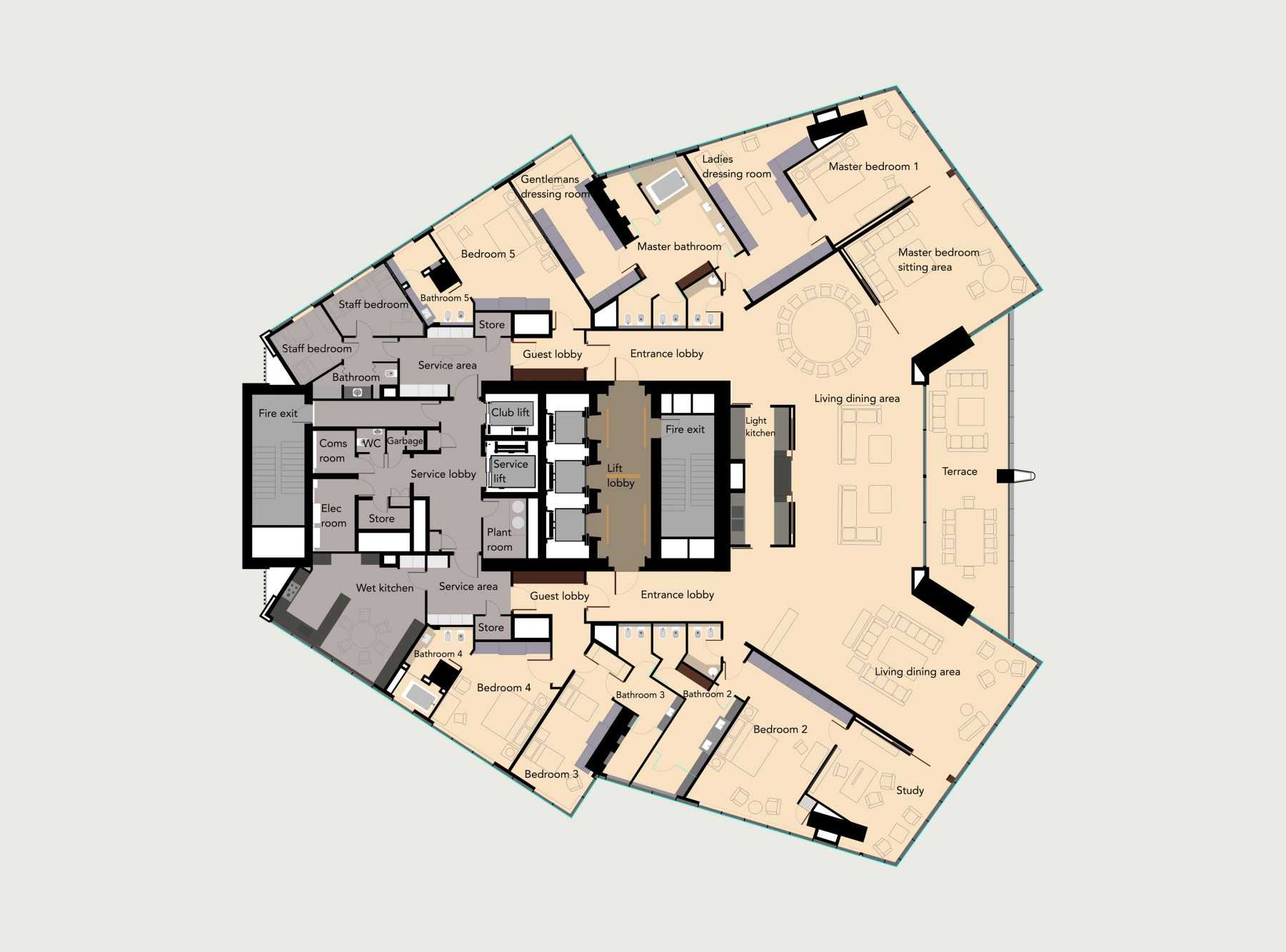 There are 45 luxurious, unique suites with 2 to 5 bedrooms in the 35-story tower. Volante Tower offers both full-floor apartments and half-floor flats. Apartments on the building's lower floors provide views of the Dubai Canal, while those on the structure's upper floors provide views of the Burj Khalifa, the highest building in the world.