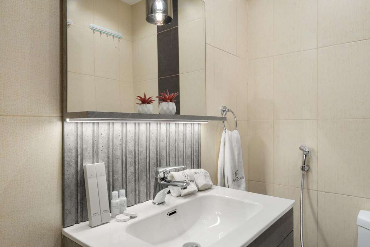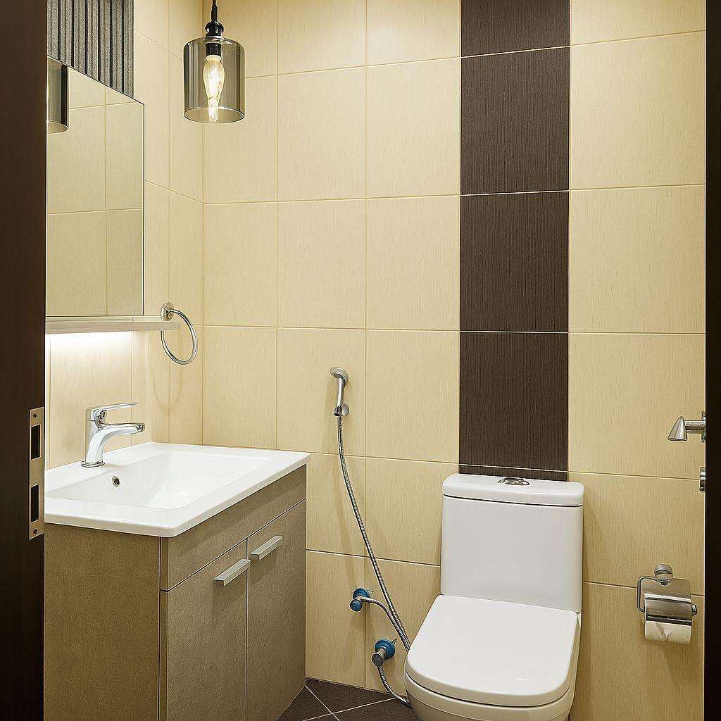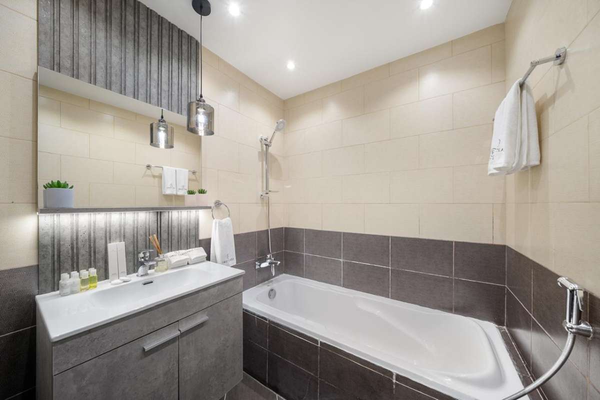 Bathrooms are finished with light and dark contrasting tiles, wall-mounted vanities and mirrors with integrated lighting. One bathroom includes a bathtub with shower, while the other provides a compact layout with useful storage and fittings. These spaces are designed for easy maintenance and regular use.