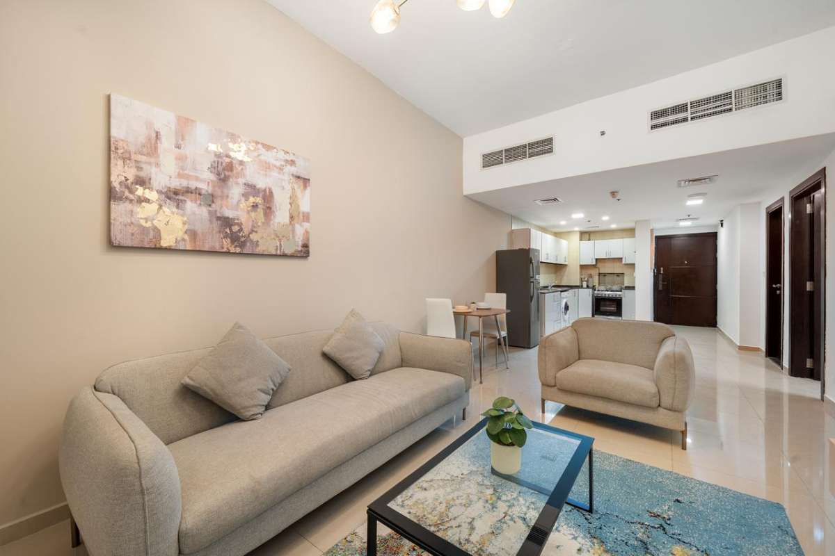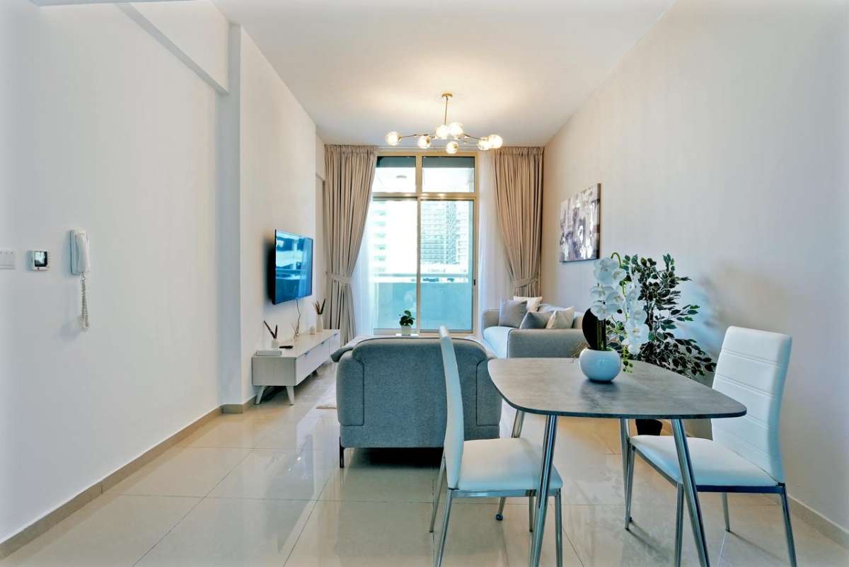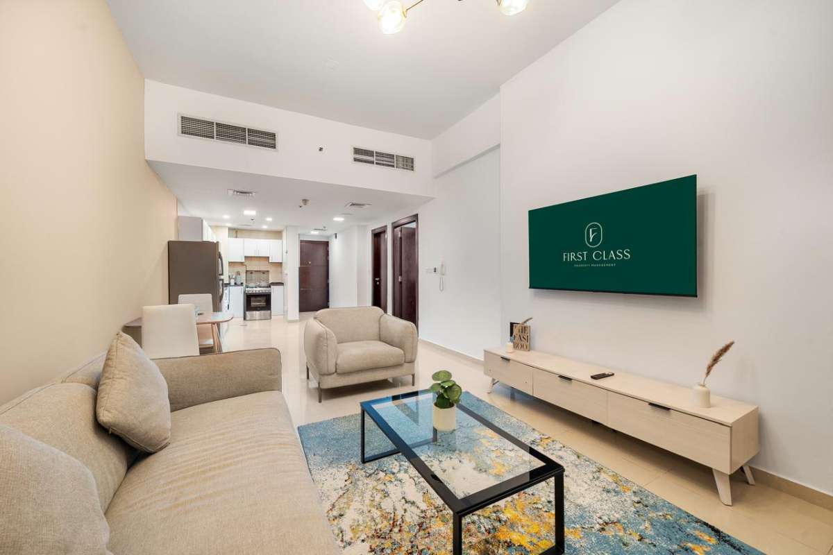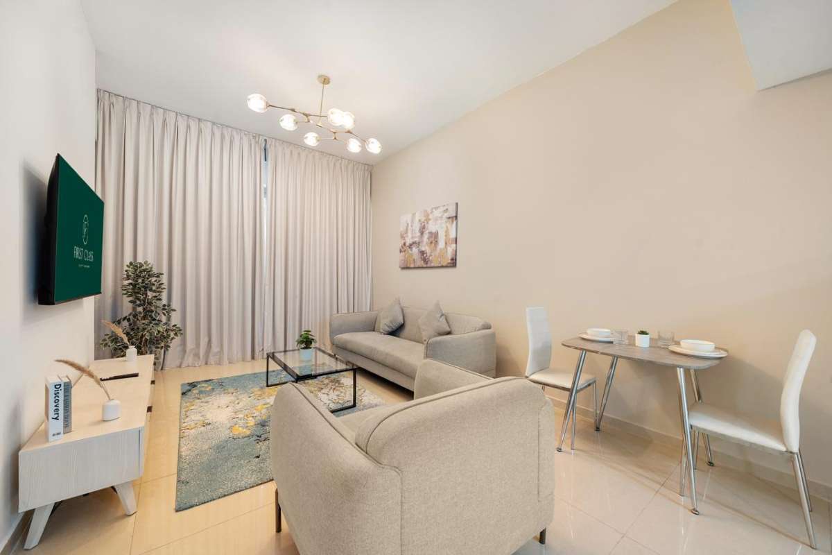 1-bedroom furnished apartment for sale in Frankfurt Sports Tower, Dubai Sports City. The home offers an efficient layout with an open-plan living and dining area, a well-planned kitchen, and a comfortable bedroom with access to outdoor space. Large windows provide natural light and pleasant golf and city views.